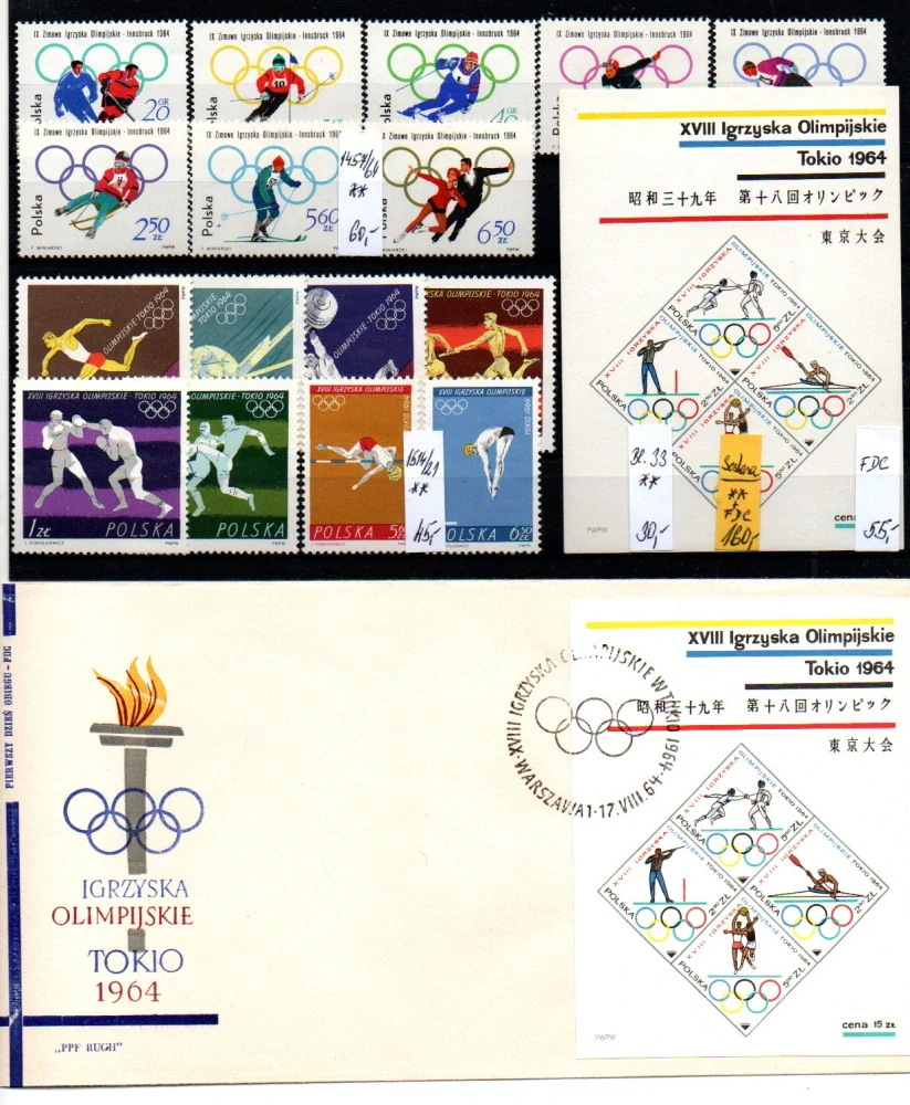 Polsko, sestava známek + aršík k OH 1964, kvalita xx - vše popsáno, k tomu FDC. Pěkná sestava. 26.03.2026